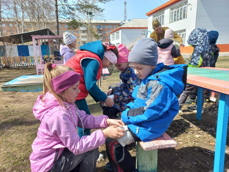 На передовой, ребятам необходимо было пройти через реку по бревну, попасть снарядом в цель и пройти тоннель. Дети побывали в военном госпитале в роли врачей и санитаров, узнали, как врачи и санитары выносили раненых бойцов с поля боя, прикрывая их собой, потренировались делать перевязки. Также ребята помогли солдатам доставить на фронт продукты, не растеряв их по дороге. А во время привала дети исполнили песню «Служить России суждено тебе и мне» и научились складывать письма-треугольники.